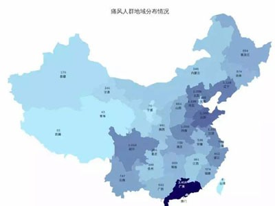 痛風患者人數(shù)分布前三省份為廣東省、山東省、河北省。沿海地區(qū)、經濟發(fā)達地區(qū)為痛風高發(fā)區(qū)