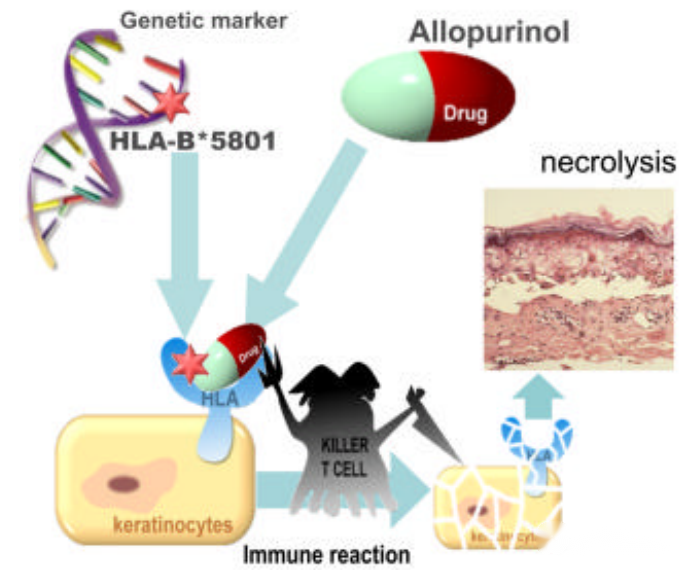 但是少部分服別嘌呤醇的患者臨床上可出現(xiàn)輕重不一的皮膚過敏反應,從輕度的斑丘疹(MPE)到嚴重皮膚過敏反應(SCARs)。尤其對于亞裔人群,使用別嘌醇可能會發(fā)生嚴重的過敏性藥疹,甚至導致人死亡。